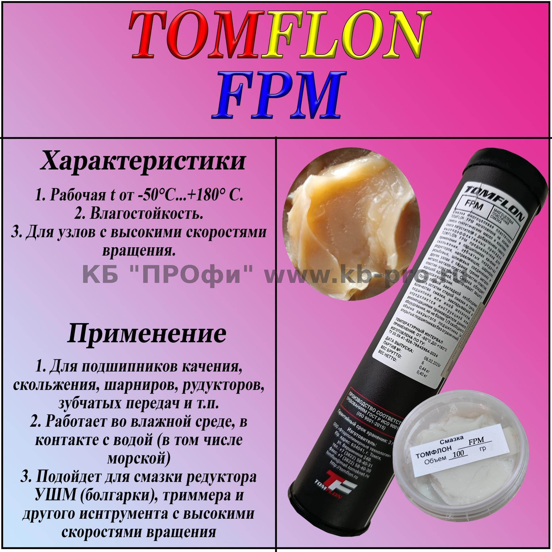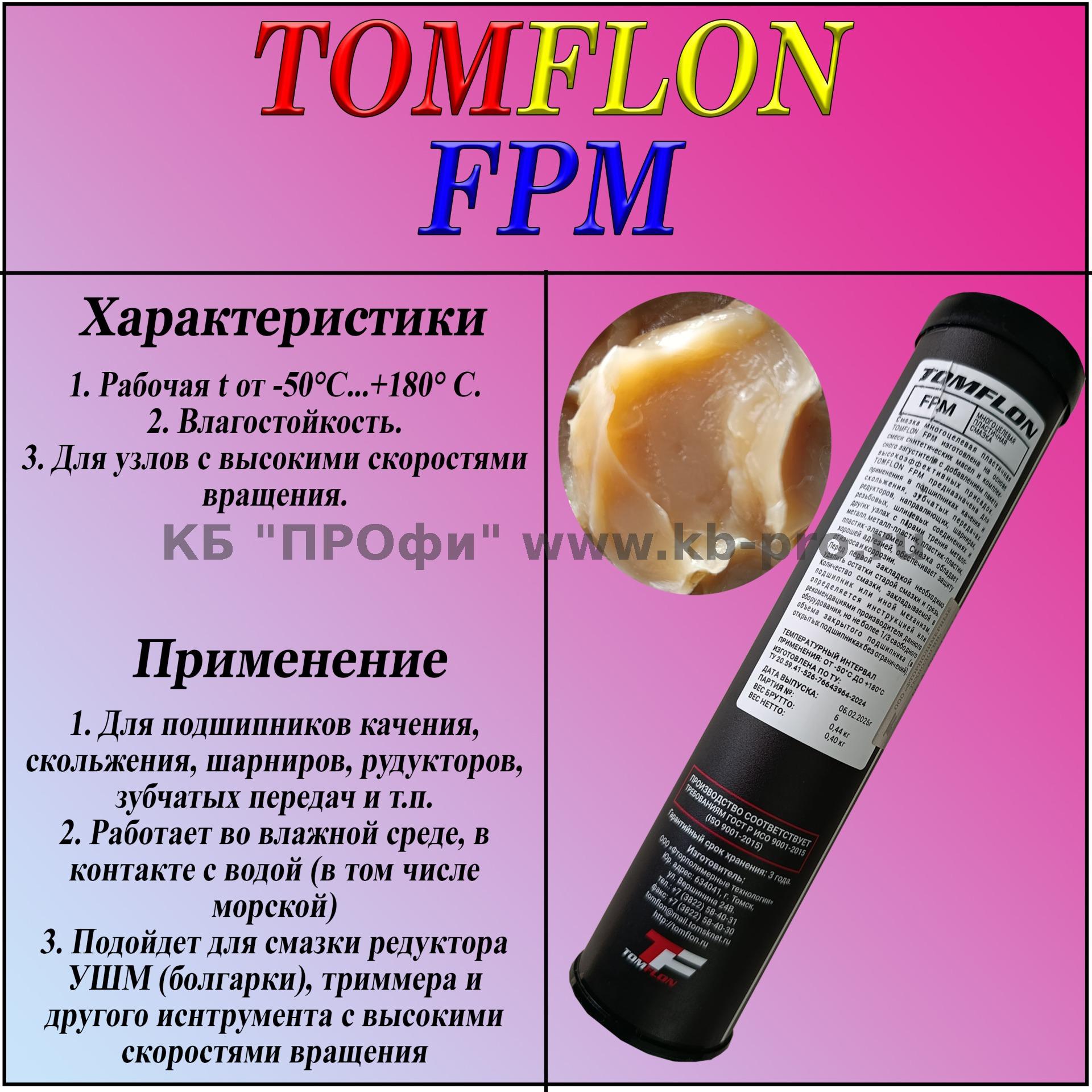Tomflon FPM изготовлена на основе синтетических масел и комплексного загустителя с добавлением пакета высокоэффективных присадок. Tomflon FPM предназначена для применения в подшипниках качения и скольжения, зубчатых передачах редукторов, направляющих, шарнирах, резьбовых и шлицевых соединениях и других узлах с парами трения металл-металл, металл-пластик, пластик-пластик, пластик-эластомер. Смазка обладает хорошей адгезией, обеспечивает защиту от износа и коррозии.